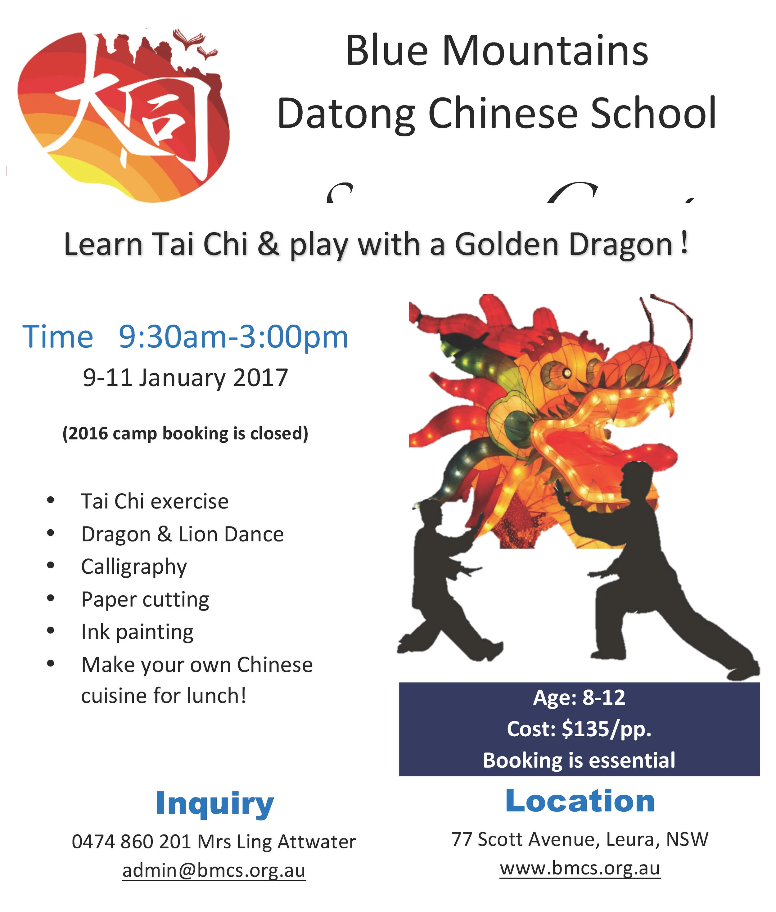 Summer Holiday Camp Monday, 9 January 2017 9:30 am 09:30 Wednesday, 11 January 2017 3:00 pm 15:00 Google Calendar ICS Summer Holiday CampActivities including Tai Chi exerciseDragon & Lion DanceCalligraphyPaper cuttingInk paintingMake your own Chinese cuisine for lunch!(Booking closed) View fullsize